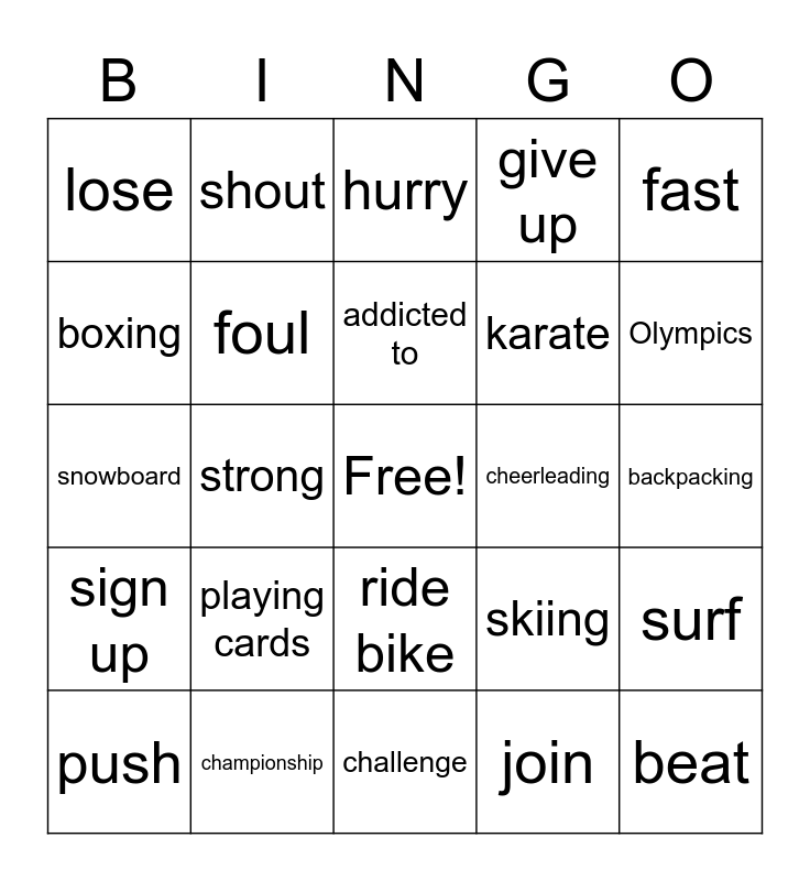 This bingo card has a free space and 24 words: playing cards, championship, addicted to, push, fast, lose, boxing, shout, cheerleading, ride bike, karate, snowboard, skiing, surf, foul, join, backpacking, hurry, Olympics, strong, beat, sign up, give up and challenge.