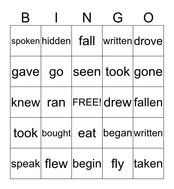 This bingo card has a free space and 24 words: bought, flew, seen, speak, drove, spoken, gave, hidden, drew, eat, took, knew, began, written, go, fly, fallen, fall, gone, ran, taken, took, written and begin.