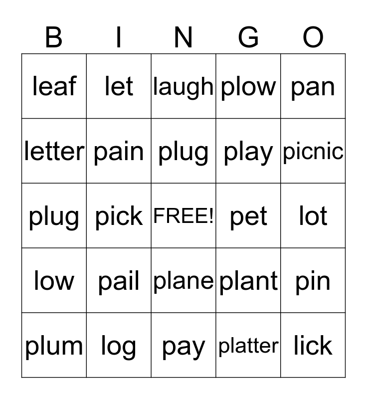 This bingo card has a free space and 24 words: pail, log, plug, plum, pan, leaf, letter, let, pet, plane, play, plug, plant, pin, pain, platter, lot, laugh, picnic, pick, lick, low, plow and pay.