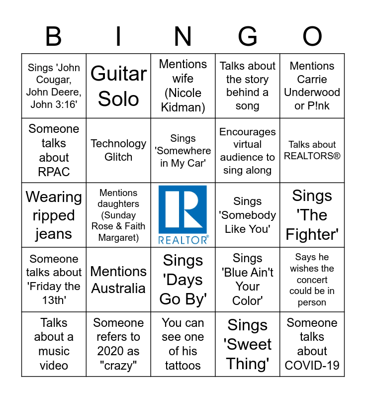 This bingo card has a free space and 24 words: Mentions Australia, Someone refers to 2020 as "crazy", Sings 'Somewhere in My Car', Talks about a music video, Mentions Carrie Underwood or P!nk, Sings 'John Cougar, John Deere, John 3:16', Someone talks about RPAC, Guitar Solo, Sings 'Somebody Like You', Sings 'Days Go By', Encourages virtual audience to sing along, Wearing ripped jeans, Sings 'Blue Ain't Your Color', Says he wishes the concert could be in person, Technology Glitch, Sings 'Sweet Thing', Sings 'The Fighter', Mentions wife (Nicole Kidman), Talks about REALTORS®, Mentions daughters (Sunday Rose & Faith Margaret), Someone talks about COVID-19, Someone talks about 'Friday the 13th', Talks about the story behind a song and You can see one of his tattoos.