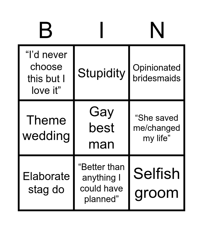 This bingo card has a free space and 8 words: “She saved me/changed my life”, Opinionated bridesmaids, Stupidity, Elaborate stag do, “I’d never choose this but I love it”, Selfish groom, Theme wedding and “Better than anything I could have planned”.