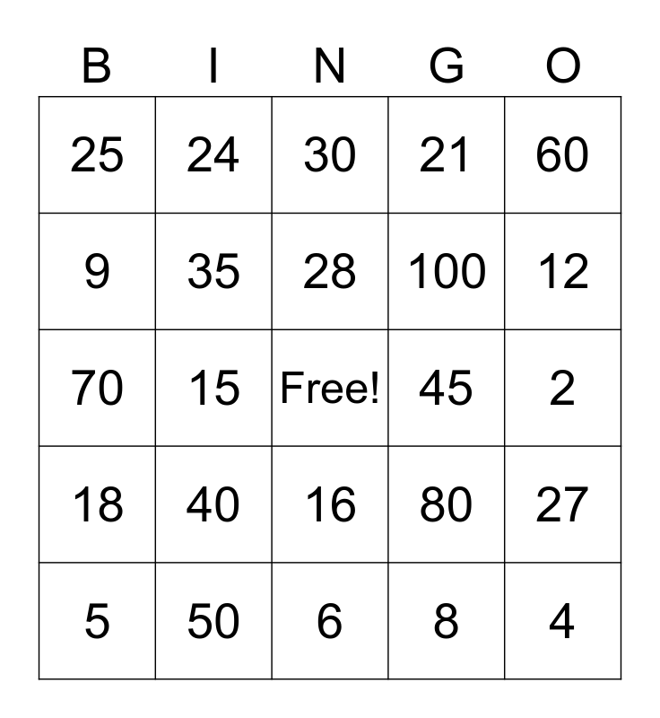 This bingo card has a free space and 29 words: 5, 10, 15, 20, 25, 30, 35, 40, 45, 50, 2, 4, 6, 8, 12, 14, 16, 18, 60, 70, 80, 90, 100, 9, 21, 24, 27, 28 and 3.