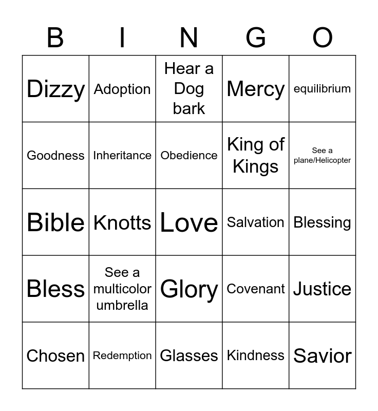 This bingo card has a free space and 30 words: Redemption, Matthew, Knotts, Abraham, Dizzy, Hear a Dog bark, Inheritance, Glory, Salvation, Glasses, Blessing, Savior, Kindness, Christ, See a plane/Helicopter, Faith, Covenant, Bless, See a multicolor umbrella, equilibrium, Bible, Hope, Adoption, King of Kings, Goodness, Mercy, Justice, Chosen, Obedience and Truth.