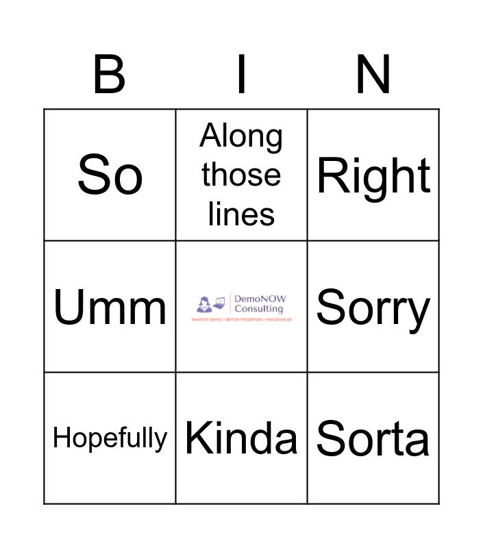This bingo card has a free space and 8 words: Sorry, Right, Along those lines, Hopefully, So, Sorta, Umm and Kinda.