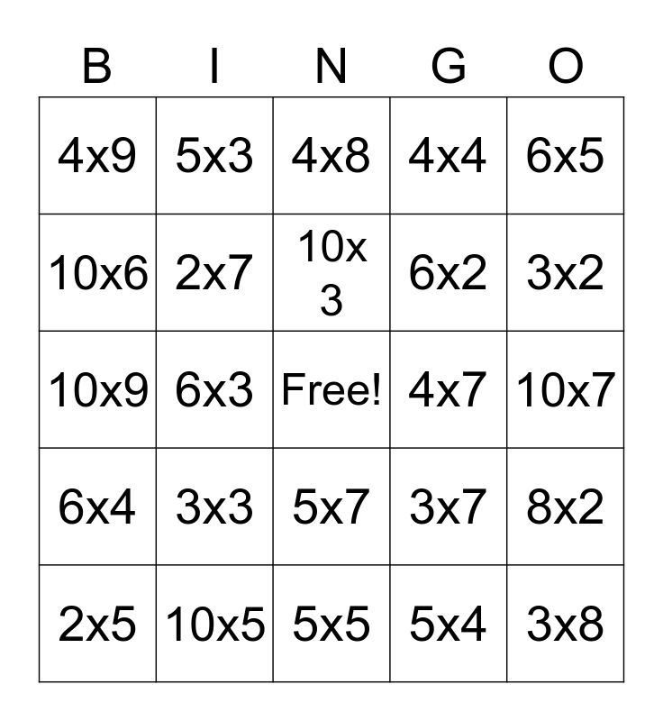 This bingo card has a free space and 34 words: 6x1, 5x4, 3x6, 2x6, 6x4, 2x7, 6x5, 2x5, 5x3, 4x3, 10x 3, 4x8, 2x9, 5x8, 4x7, 3x2, 10x5, 10x9, 3x3, 3x7, 5x7, 5x9, 4x9, 10x7, 5x5, 3x8, 4x4, 5x6, 6x2, 10x6, 10x2, 6x3, 8x2 and 8x3.