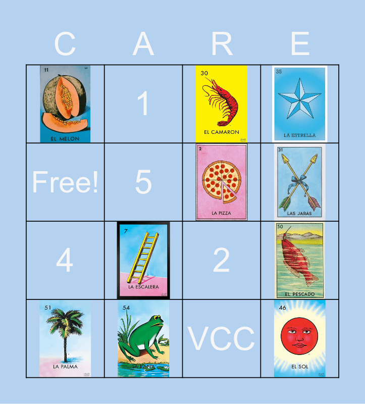 This bingo card has 22 images and 14 words: Free!, VCC, Campus Advocate, care, 1, 2, 3, 4, 5, OMBUDS, CAPS, Distract, Delegate and Direct.