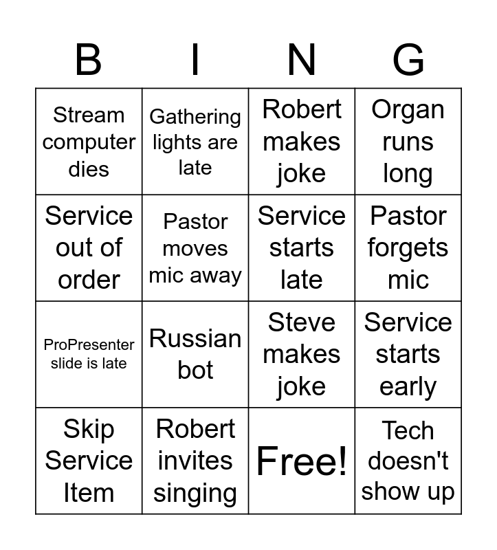 This bingo card has 17 words: Free!, Skip Service Item, Robert makes joke, Stream computer dies, Russian bot, Organ runs long, Service starts early, Service starts late, Pastor forgets mic, Pastor moves mic away, Robert invites singing, Steve makes joke, Service out of order, Gathering lights are late, ProPresenter slide is late, Forgets lyrics and Tech doesn't show up.