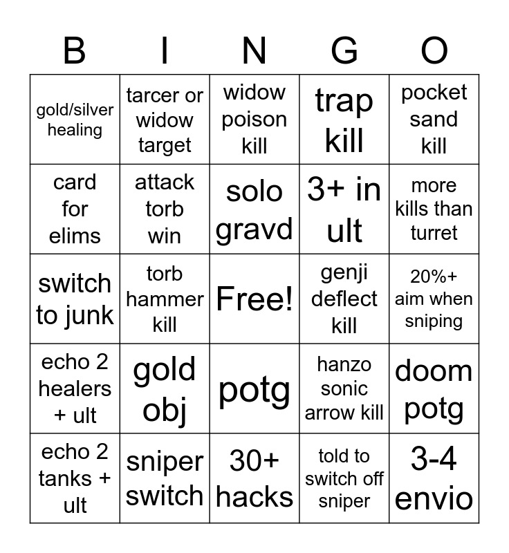 This bingo card has a free space and 24 words: gold obj, sniper switch, solo gravd, echo 2 tanks + ult, pocket sand kill, gold/silver healing, card for elims, tarcer or widow target, genji deflect kill, potg, 3+ in ult, switch to junk, hanzo sonic arrow kill, doom potg, attack torb win, told to switch off sniper, 20%+ aim when sniping, widow poison kill, more kills than turret, torb hammer kill, 3-4 envio, echo 2 healers + ult, trap kill and 30+ hacks.