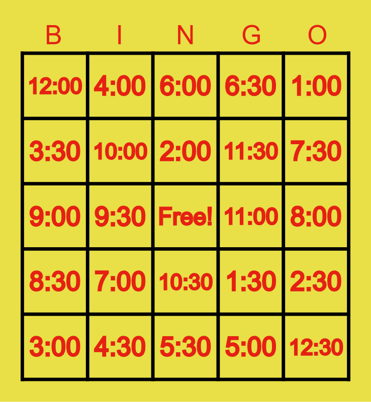 This bingo card has a free space and 24 words: 3:00, 7:00, 2:00, 5:00, 1:00, 12:00, 4:00, 6:00, 11:00, 8:00, 9:00, 10:00, 1:30, 2:30, 3:30, 4:30, 5:30, 6:30, 7:30, 8:30, 9:30, 10:30, 11:30 and 12:30.