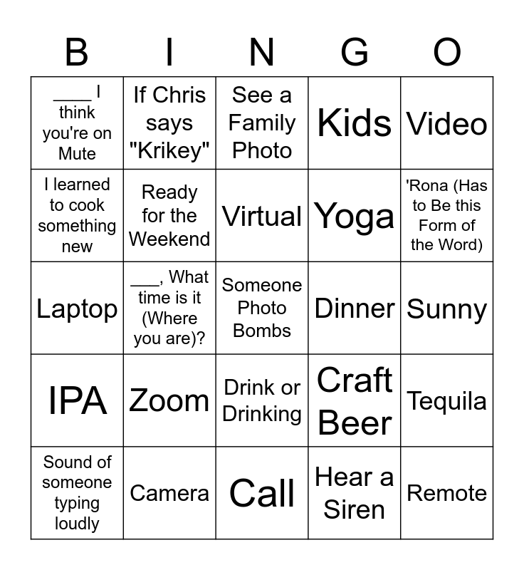 This bingo card has 44 words: Free!, Someone Photo Bombs, Someone Drinking Water, Sound of someone typing loudly, Hear a Dog Barking, Hear a Siren, See a Family Photo, See Someone Wearing a Sports Team Shirt, Video, Camera, Kids, Dinner, Drink or Drinking, Zoom, Skype, Call, Netflix, Laptop, Family, 'Rona (Has to Be this Form of the Word), If Chris says "Krikey", Exercise, Walk, ____ I think you're on Mute, Rain, Sunny, Gain Weight, Family, Craft Beer, IPA, Vodka, Tequila, Homeschool, Is ___ on the Call?, ___, What time is it (Where you are)?, Tiger King, Amazon, Remote, Virtual, I learned to cook something new, Yoga, Election, Ready for the Weekend and Safe.