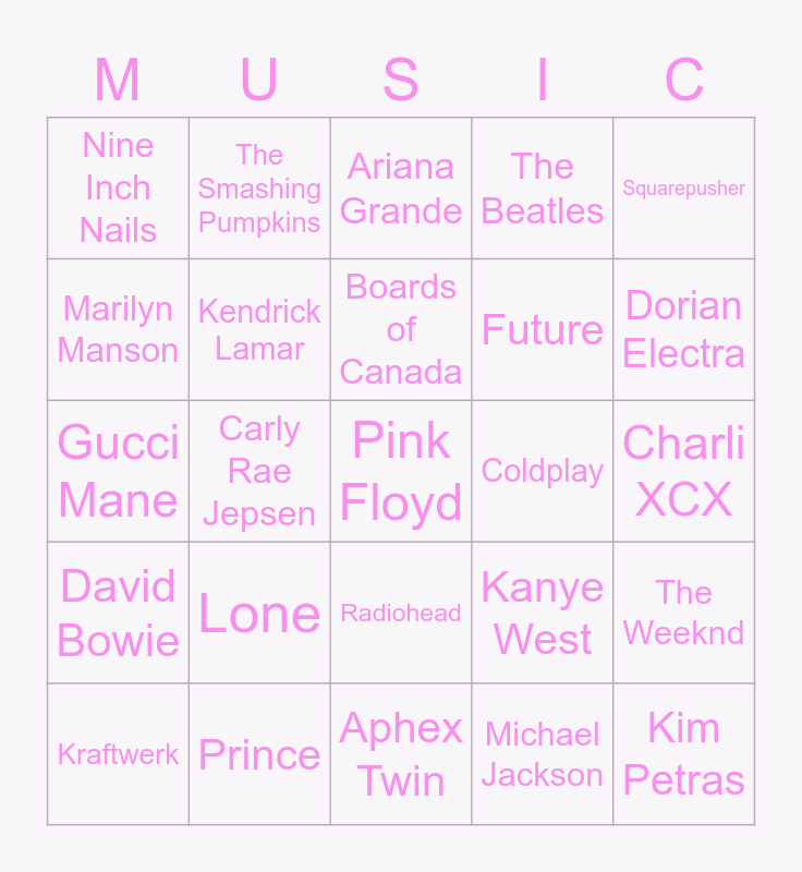 This bingo card has 25 words: Lone, Aphex Twin, Boards of Canada, Kraftwerk, Squarepusher, Nine Inch Nails, Marilyn Manson, The Smashing Pumpkins, Coldplay, Radiohead, Future, Gucci Mane, Kanye West, The Weeknd, Kendrick Lamar, Kim Petras, Charli XCX, Ariana Grande, Dorian Electra, Carly Rae Jepsen, Pink Floyd, Prince, David Bowie, The Beatles and Michael Jackson.