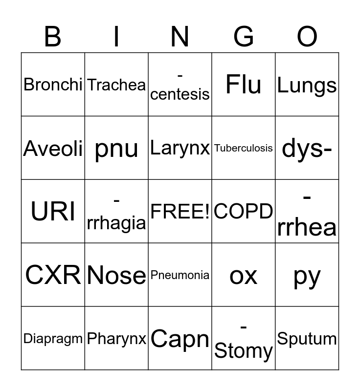 This bingo card has a free space and 24 words: Nose, Pharynx, Larynx, Diapragm, Lungs, Bronchi, Aveoli, Trachea, COPD, Pneumonia, Tuberculosis, URI, ox, py, pnu, -Stomy, -rrhea, -centesis, dys-, -rrhagia, Sputum, CXR, Flu and Capn.