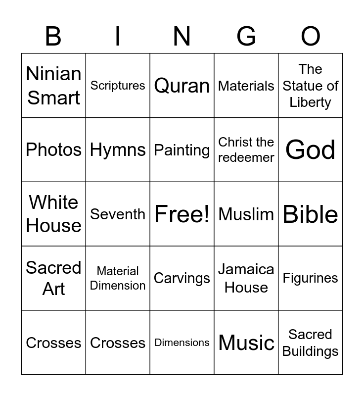 This bingo card has a free space and 24 words: Material Dimension, Crosses, Painting, Crosses, The Statue of Liberty, Ninian Smart, Photos, Scriptures, Muslim, Carvings, Christ the redeemer, White House, Jamaica House, Figurines, Hymns, Music, Bible, Quran, God, Seventh, Sacred Buildings, Sacred Art, Materials and Dimensions.