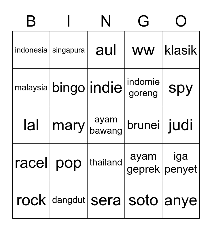 This bingo card has a free space and 24 words: pop, dangdut, indie, rock, klasik, indonesia, malaysia, singapura, brunei, thailand, indomie goreng, lal, ayam geprek, iga penyet, bingo, soto, judi, aul, spy, mary, anye, racel, ww and sera.