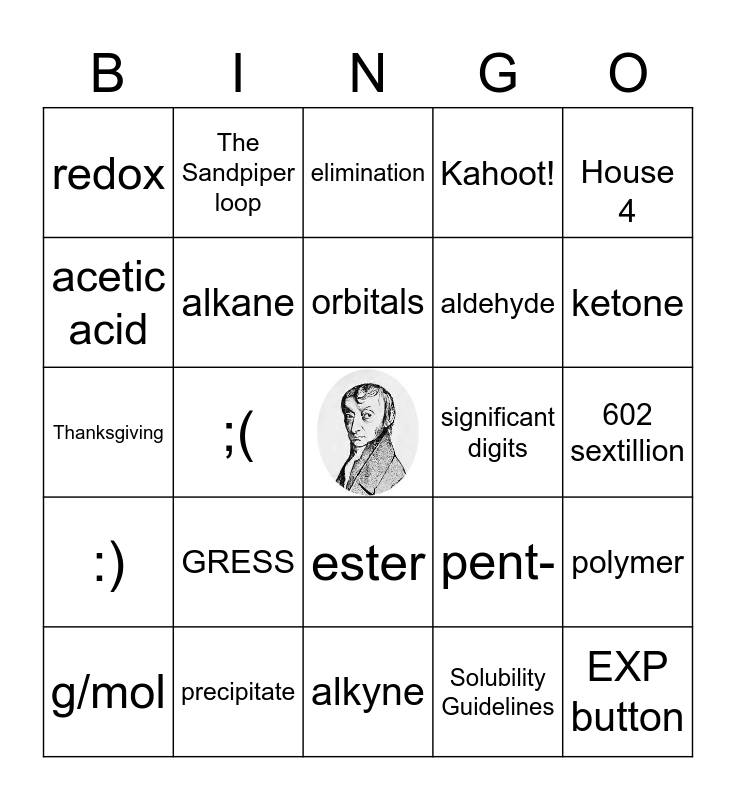 This bingo card has a free space and 39 words: the mole, molar concentration, pipette, alkane, g/mol, ester, orbitals, rm 242, House 4, :), ;(, Kahoot!, EXP button, 602 sextillion, significant digits, GRESS, units, redox, Galvanic cell, pent-, acetic acid, alkyne, aldehyde, ketone, Activity Series, halogens, rare earth metals, alkali metals, The Paolo loop, The Sandpiper loop, Quad 1, synthesis, elimination, precipitate, Solubility Guidelines, hydrogenation, polymer, Thanksgiving and Halloween.
