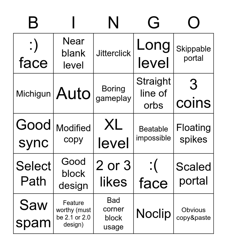 This bingo card has a free space and 24 words: Good block design, Feature worthy (must be 2.1 or 2.0 design), Boring gameplay, Saw spam, Skippable portal, :) face, Michigun, Near blank level, Beatable impossible, 2 or 3 likes, Straight line of orbs, Good sync, :( face, Scaled portal, Auto, Noclip, Floating spikes, Jitterclick, 3 coins, Modified copy, Obvious copy&paste, Select Path, Long level and Bad corner block usage.
