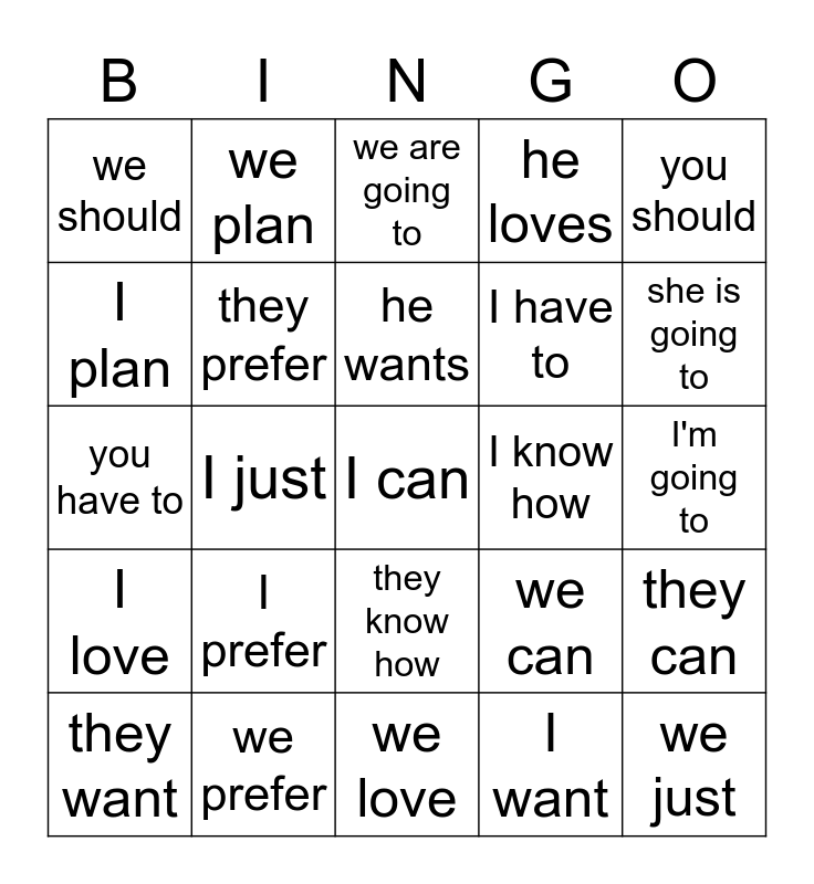 This bingo card has a free space and 24 words: I prefer, we prefer, he wants, they want, you should, we should, I plan, we plan, I know how, they know how, I have to, you have to, we can, they can, they prefer, I want, I'm going to, we are going to, she is going to, I just, we just, I love, he loves and we love.