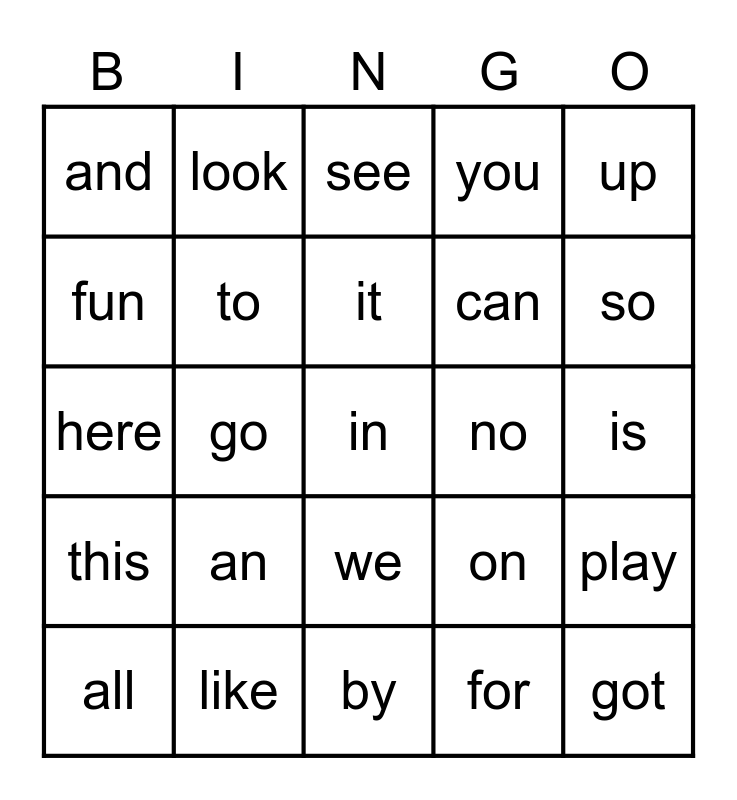 This bingo card has 25 words: an, by, it, all, up, and, fun, look, no, we, can, here, on, play, to, got, is, see, so, go, in, like, this, you and for.