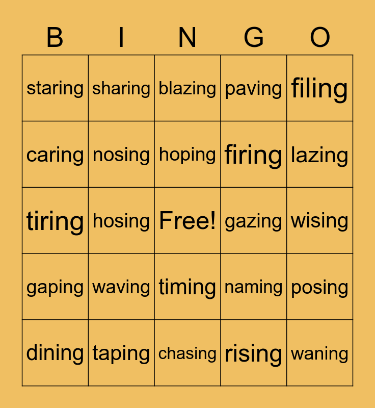 This bingo card has a free space and 24 words: waving, taping, hoping, dining, filing, staring, caring, sharing, gazing, timing, firing, tiring, naming, posing, nosing, rising, wising, blazing, lazing, hosing, waning, gaping, paving and chasing.