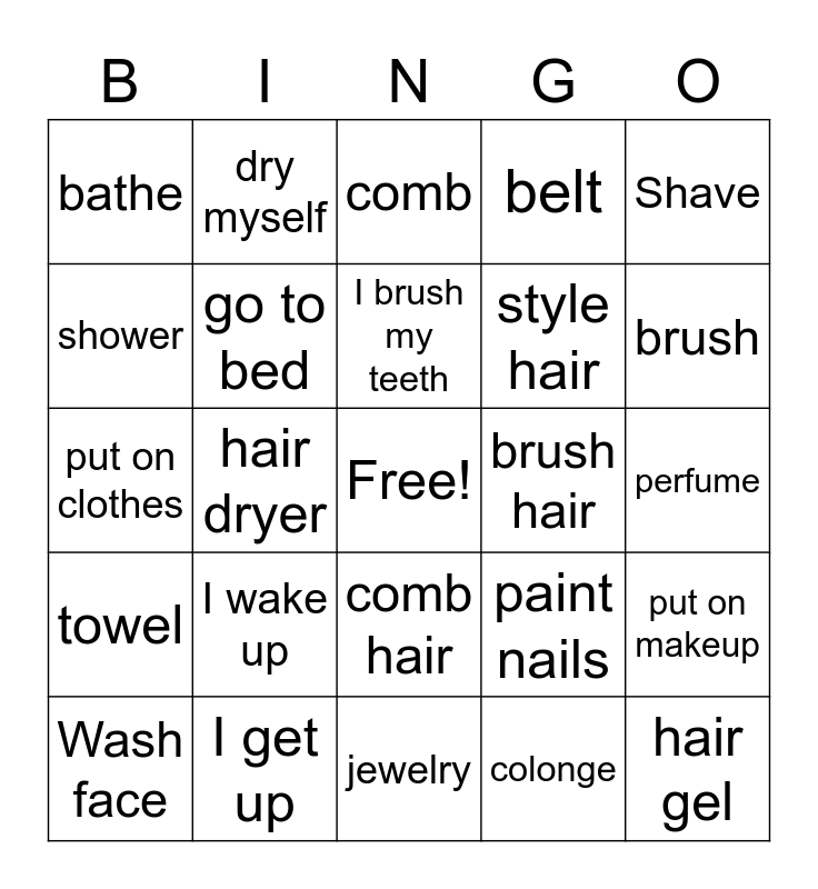 This bingo card has a free space and 24 words: I wake up, I get up, I brush my teeth, Wash face, Shave, bathe, shower, dry myself, brush hair, comb hair, style hair, put on clothes, paint nails, put on makeup, go to bed, colonge, perfume, comb, brush, hair dryer, hair gel, towel, belt and jewelry.
