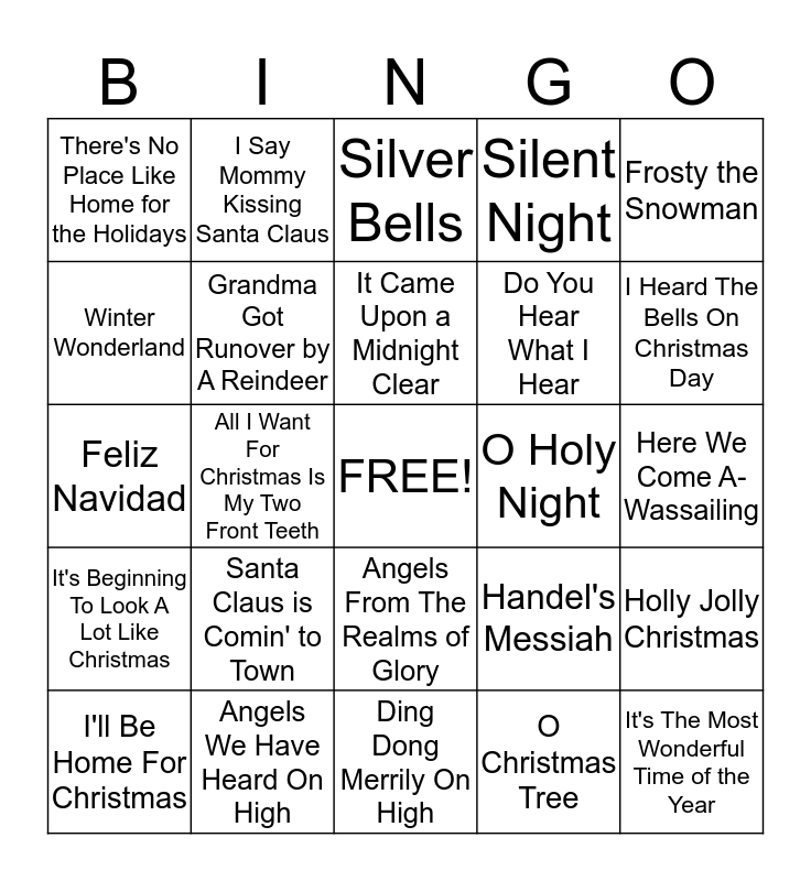 This bingo card has a free space and 24 words: Santa Claus is Comin' to Town, Angels We Have Heard On High, It Came Upon a Midnight Clear, I'll Be Home For Christmas, Frosty the Snowman, There's No Place Like Home for the Holidays, Winter Wonderland, I Say Mommy Kissing Santa Claus, O Holy Night, Angels From The Realms of Glory, Do You Hear What I Hear, Feliz Navidad, Handel's Messiah, Holly Jolly Christmas, Grandma Got Runover by A Reindeer, O Christmas Tree, Here We Come A-Wassailing, Silver Bells, I Heard The Bells On Christmas Day, All I Want For Christmas Is My Two Front Teeth, It's The Most Wonderful Time of the Year, It's Beginning To Look A Lot Like Christmas, Silent Night and Ding Dong Merrily On High.