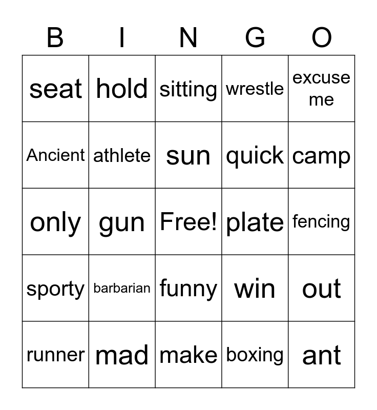 This bingo card has a free space and 24 words: barbarian, mad, sun, runner, excuse me, seat, Ancient, hold, plate, funny, quick, only, win, out, athlete, boxing, fencing, sitting, camp, gun, ant, sporty, wrestle and make.