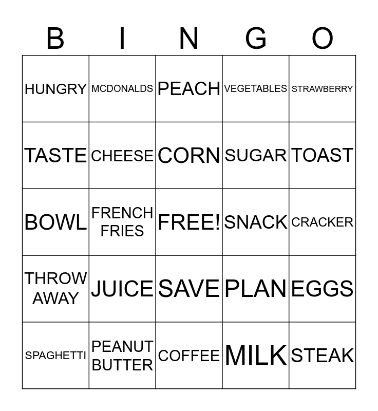 This bingo card has a free space and 24 words: JUICE, PEANUT BUTTER, CORN, SPAGHETTI, STRAWBERRY, HUNGRY, TASTE, MCDONALDS, SNACK, SAVE, SUGAR, BOWL, PLAN, EGGS, CHEESE, MILK, CRACKER, PEACH, TOAST, FRENCH FRIES, STEAK, THROW AWAY, VEGETABLES and COFFEE.