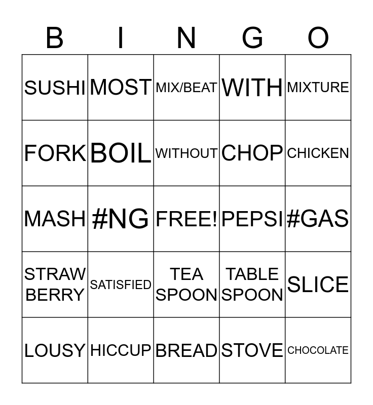 This bingo card has a free space and 24 words: SATISFIED, HICCUP, WITHOUT, LOUSY, MIXTURE, SUSHI, FORK, MOST, PEPSI, TEA SPOON, CHOP, MASH, TABLE SPOON, SLICE, BOIL, STOVE, #GAS, MIX/BEAT, CHICKEN, #NG, CHOCOLATE, STRAW BERRY, WITH and BREAD.