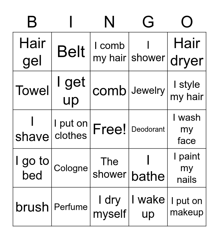 This bingo card has a free space and 24 words: Cologne, Perfume, comb, brush, Hair dryer, Hair gel, Towel, Belt, Deodorant, The shower, Jewelry, I shave, I bathe, I paint my nails, I get up, I wake up, I wash my face, I comb my hair, I style my hair, I put on clothes, I put on makeup, I go to bed, I shower and I dry myself.