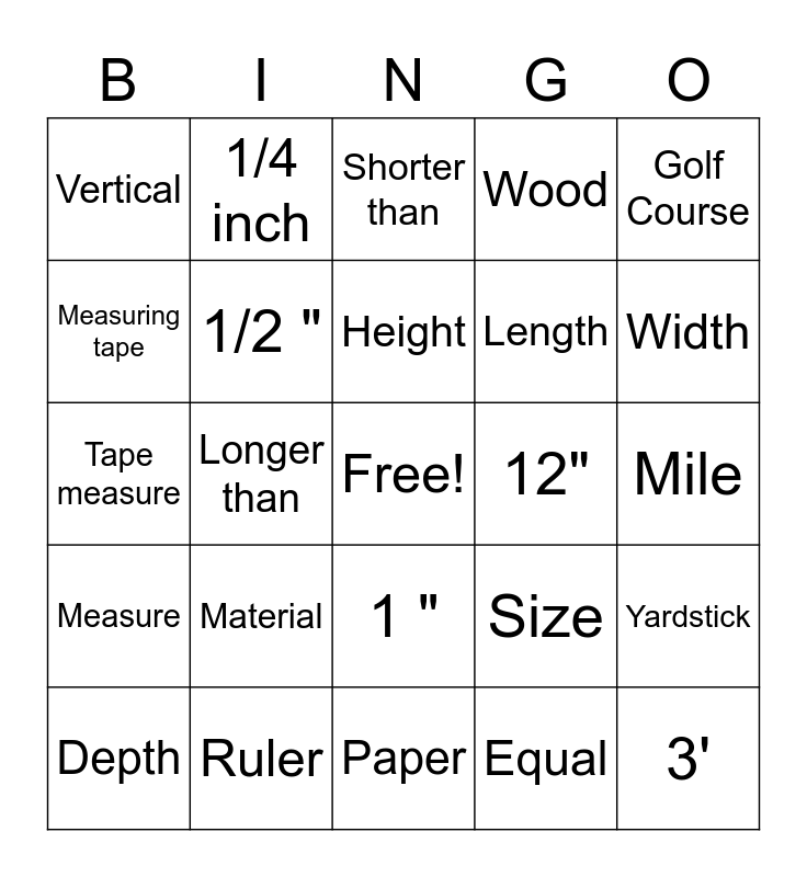 This bingo card has a free space and 28 words: Yardstick, Horizontal, Length, Equal, Measuring tape, Shorter than, 1/4 inch, Measure, 12", Depth, Tape measure, Wood, Ruler, Paper, Width, 6", Material, 1/2 ", Height, 1 ", Vertical, 3/4 in, 3', Longer than, Mile, Size, Golf Course and Door.