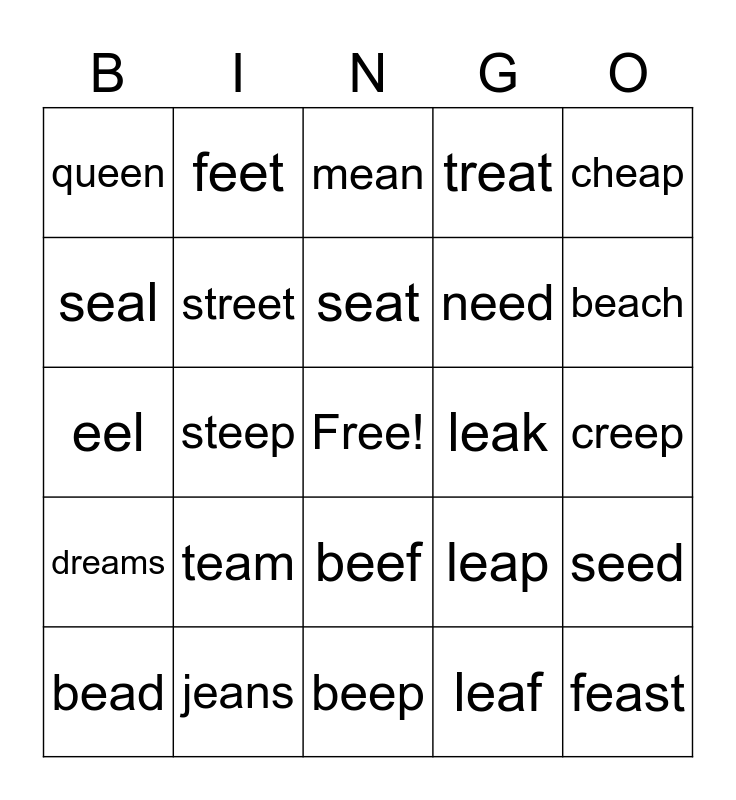 This bingo card has a free space and 28 words: seed, read, need, leaf, seal, mean, feet, dreams, leak, bead, eel, treat, jeans, beep, beach, sheep, team, street, seat, beef, queen, green, feast, steep, creep, leap, cheap and scream.