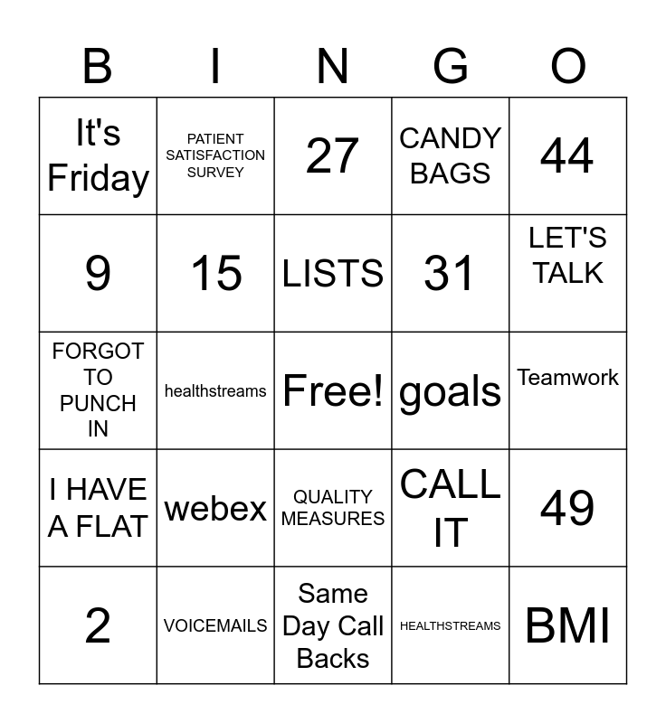 This bingo card has a free space and 24 words: 2, webex, LISTS, HEALTHSTREAMS, 44, It's Friday, PATIENT SATISFACTION SURVEY, 27, goals, Teamwork, FORGOT TO PUNCH IN, 15, CALL IT, 49, 9, VOICEMAILS, Same Day Call Backs, CANDY BAGS, LET'S TALK, I HAVE A FLAT, healthstreams, QUALITY MEASURES, 31 and BMI.