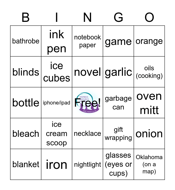 This bingo card has a free space and 24 words: blanket, ice cream scoop, novel, glasses (eyes or cups), orange, bathrobe, ink pen, notebook paper, garbage can, oven mitt, bottle, ice cubes, gift wrapping, onion, blinds, iron, nightlight, game, oils (cooking), bleach, iphone/ipad, necklace, garlic and Oklahoma (on a map).