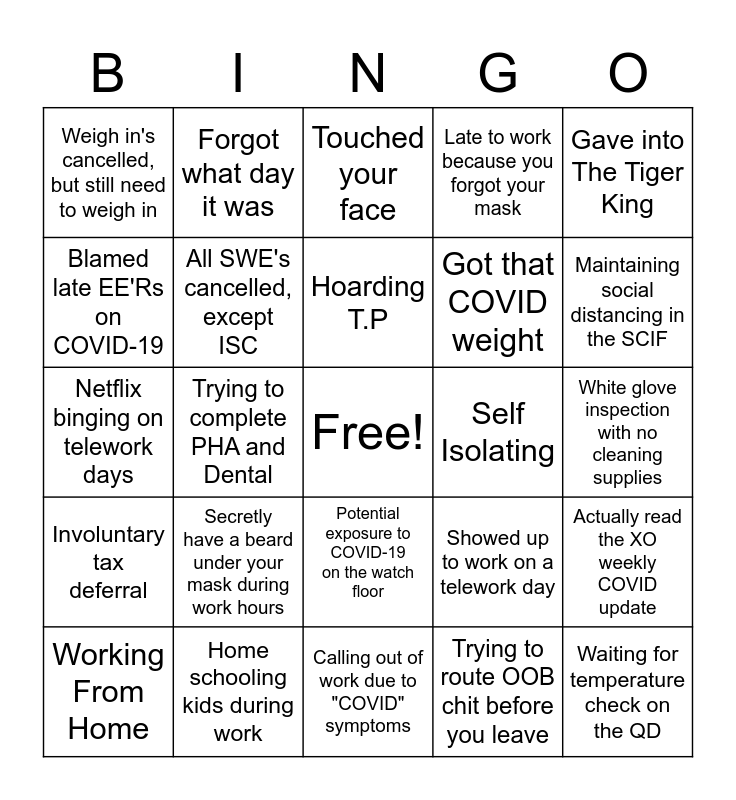 This bingo card has a free space and 24 words: Secretly have a beard under your mask during work hours, Home schooling kids during work, Hoarding T.P, Working From Home, Gave into The Tiger King, Weigh in's cancelled, but still need to weigh in, Blamed late EE'Rs on COVID-19, Forgot what day it was, Self Isolating, Potential exposure to COVID-19 on the watch floor, Got that COVID weight, Netflix binging on telework days, Showed up to work on a telework day, Actually read the XO weekly COVID update, All SWE's cancelled, except ISC, Trying to route OOB chit before you leave, White glove inspection with no cleaning supplies, Touched your face, Maintaining social distancing in the SCIF, Trying to complete PHA and Dental, Waiting for temperature check on the QD, Involuntary tax deferral, Late to work because you forgot your mask and Calling out of work due to "COVID" symptoms.