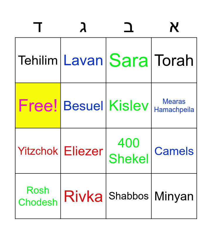 This bingo card has 16 words: Rivka, Camels, Sara, Tehilim, Yitzchok, Lavan, 400 Shekel, Shabbos, Free!, Besuel, Rosh Chodesh, Torah, Eliezer, Mearas Hamachpeila, Kislev and Minyan.