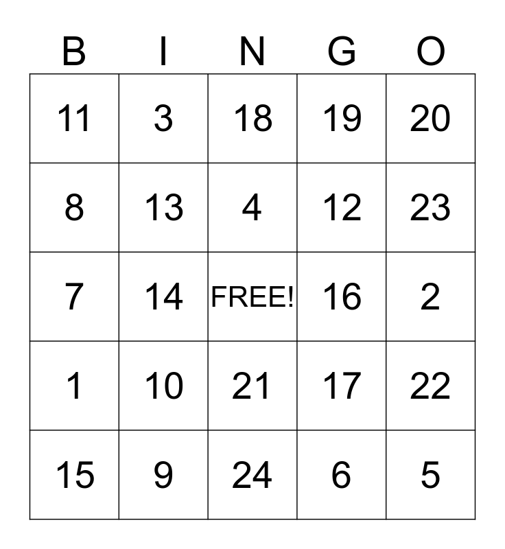 This bingo card has a free space and 24 words: 10, 9, 4, 15, 20, 11, 8, 3, 16, 21, 12, 7, 17, 22, 13, 6, 2, 18, 23, 14, 5, 1, 19 and 24.