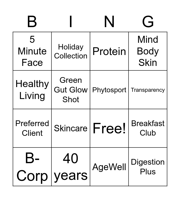 This bingo card has 19 words: Free!, Fizz, Protein, Digestion Plus, Breakfast Club, Healthy Living, AgeWell, 5 Minute Face, Holiday Collection, Preferred Client, Skincare, Green Gut Glow Shot, Phytosport, 40 years, B-Corp, Terracycle, Mind Body Skin, Transparency and Sustainability.