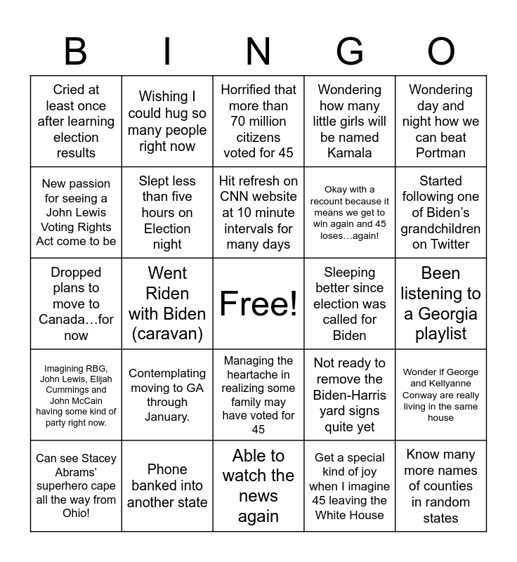 This bingo card has a free space and 30 words: Phone banked into another state, Canvassed door-to-door, Went Riden with Biden (caravan), Tried to figure out how many days John King and Steve Kornacki went without a change of clothes, Cried at least once after learning election results, Horrified that more than 70 million citizens voted for 45, Slept less than five hours on Election night, Managing the heartache in realizing some family may have voted for 45, Sleeping better since election was called for Biden, Able to watch the news again, Been listening to a Georgia playlist, Know many more names of counties in random states, Get a special kind of joy when I imagine 45 leaving the White House, Joyous that a dog will live in the White House again, Started following one of Biden’s grandchildren on Twitter, Walking carefully over those glass shards now scattered all over the ground, Not ready to remove the Biden-Harris yard signs quite yet, Imagining RBG, John Lewis, Elijah Cummings and John McCain having some kind of party right now., Contemplating moving to GA through January., Wondering day and night how we can beat Portman, Dropped plans to move to Canada…for now, Spending time assembling my fantasy cabinet, Wishing I could hug so many people right now, Okay with a recount because it means we get to win again and 45 loses…again!, New passion for seeing a John Lewis Voting Rights Act come to be, Wondering how many little girls will be named Kamala, Wonder if George and Kellyanne Conway are really living in the same house, Can see Stacey Abrams’ superhero cape all the way from Ohio!, Hit refresh on CNN website at 10 minute intervals for many days and Hoping 45 soon will be wearing orange.