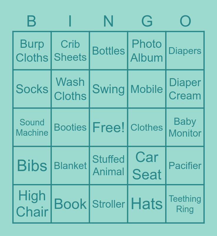 This bingo card has a free space and 24 words: Blanket, Book, Swing, High Chair, Diapers, Burp Cloths, Socks, Crib Sheets, Clothes, Stuffed Animal, Mobile, Sound Machine, Car Seat, Pacifier, Wash Cloths, Hats, Baby Monitor, Bottles, Diaper Cream, Booties, Teething Ring, Bibs, Photo Album and Stroller.