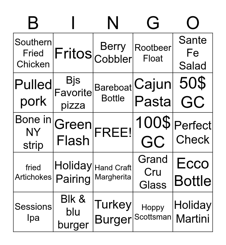 This bingo card has a free space and 24 words: Holiday Pairing, Blk & blu burger, Bareboat Bottle, Sessions Ipa, Sante Fe Salad, Southern Fried Chicken, Pulled pork, Fritos, 100$ GC, Hand Craft Margherita, Cajun Pasta, Bone in NY strip, Grand Cru Glass, Ecco Bottle, Bjs Favorite pizza, Hoppy Scottsman, Perfect Check, Berry Cobbler, 50$ GC, Green Flash, Holiday Martini, fried Artichokes, Rootbeer Float and Turkey Burger.