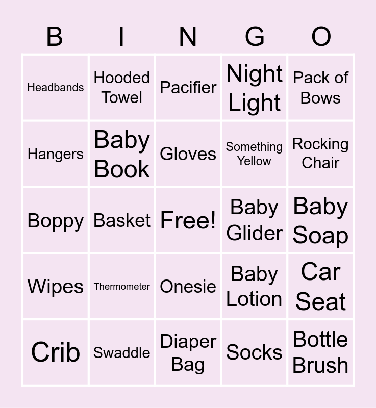 This bingo card has a free space and 26 words: Onesie, Socks, Gloves, Swaddle, Pack of Bows, Headbands, Hangers, Hooded Towel, Baby Soap, Baby Lotion, Something Yellow, Boppy, Car Seat, Crib, Basket, Baby Mobile, Night Light, Wipes, Pacifier, Bottle Brush, Rocking Chair, Diaper Bag, Baby Glider, Thermometer, Baby Book and Stroller.