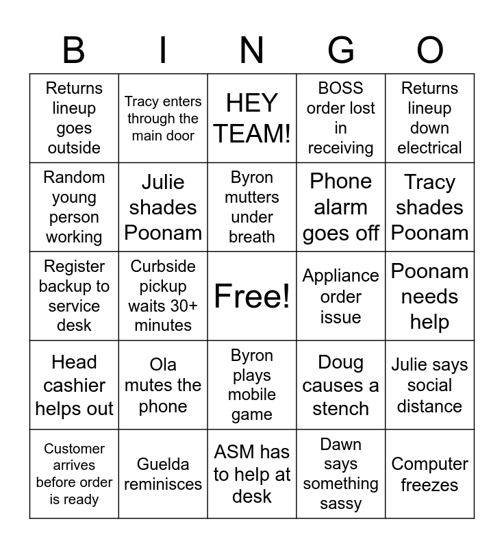 This bingo card has a free space and 24 words: Ola mutes the phone, Guelda reminisces, Byron mutters under breath, Customer arrives before order is ready, Returns lineup down electrical, Returns lineup goes outside, Random young person working, Tracy enters through the main door, Appliance order issue, Byron plays mobile game, Phone alarm goes off, Register backup to service desk, Doug causes a stench, Julie says social distance, Julie shades Poonam, Dawn says something sassy, Poonam needs help, HEY TEAM!, Tracy shades Poonam, Curbside pickup waits 30+ minutes, Computer freezes, Head cashier helps out, BOSS order lost in receiving and ASM has to help at desk.