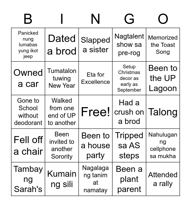This bingo card has a free space and 24 words: Been invited to another Sorority, Kumain ng sili, Eta for Excellence, Tambay ng Sarah's, Memorized the Toast Song, Panicked nung lumabas yung ikot jeep, Owned a car, Dated a brod, Had a crush on a brod, Been to a house party, Setup Christmas decor as early as September, Gone to School without deodorant, Tripped sa AS steps, Nahulugan ng cellphone sa mukha, Tumatalon tuwing New Year, Been a plant parent, Talong, Slapped a sister, Been to the UP Lagoon, Walked from one end of UP to another, Attended a rally, Fell off a chair, Nagtalent show sa pre-rog and Nagalaga ng tanim at namatay.