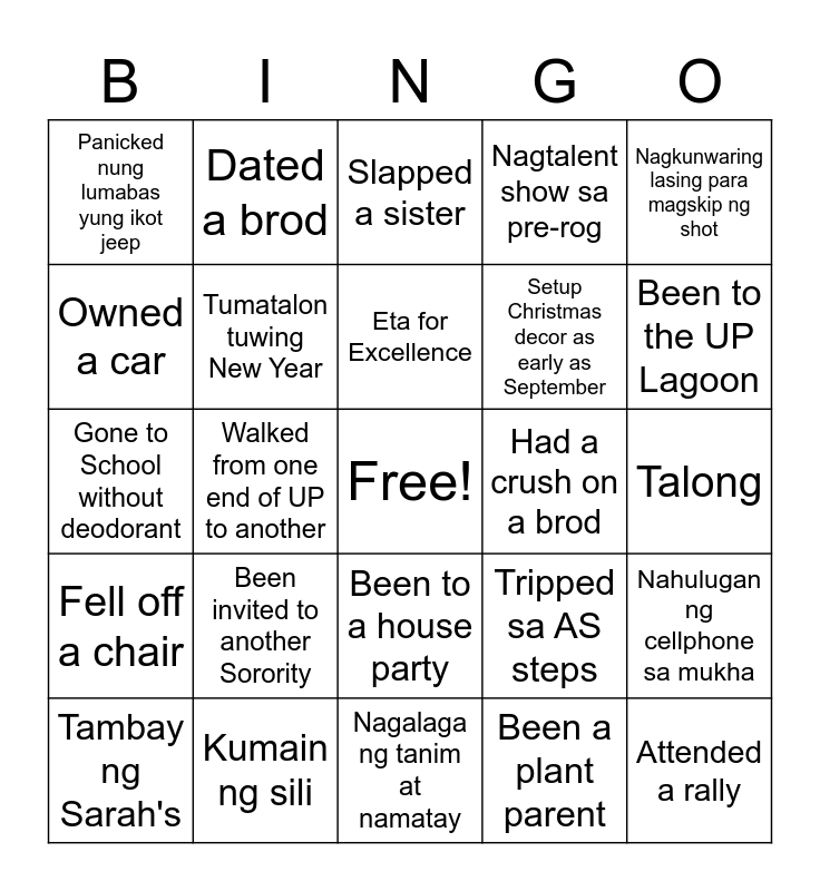 This bingo card has a free space and 24 words: Been invited to another Sorority, Kumain ng sili, Eta for Excellence, Tambay ng Sarah's, Nagkunwaring lasing para magskip ng shot, Panicked nung lumabas yung ikot jeep, Owned a car, Dated a brod, Had a crush on a brod, Been to a house party, Setup Christmas decor as early as September, Gone to School without deodorant, Tripped sa AS steps, Nahulugan ng cellphone sa mukha, Tumatalon tuwing New Year, Been a plant parent, Talong, Slapped a sister, Been to the UP Lagoon, Walked from one end of UP to another, Attended a rally, Fell off a chair, Nagtalent show sa pre-rog and Nagalaga ng tanim at namatay.