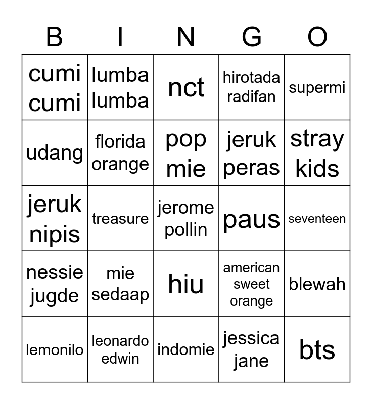 This bingo card has 25 words: mie sedaap, indomie, pop mie, lemonilo, supermi, cumi cumi, udang, lumba lumba, paus, hiu, jeruk peras, jeruk nipis, american sweet orange, blewah, florida orange, bts, seventeen, nct, stray kids, treasure, jerome pollin, leonardo edwin, nessie jugde, hirotada radifan and jessica jane.
