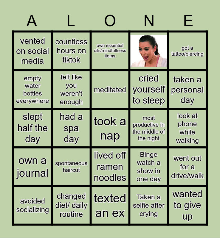 This bingo card has 1 images and 24 words: spontaneous haircut, texted an ex, meditated, avoided socializing, got a tattoo/piercing, vented on social media, empty water bottles everywhere, countless hours on tiktok, most productive in the middle of the night, lived off ramen noodles, cried yourself to sleep, slept half the day, Binge watch a show in one day, went out for a drive/walk, felt like you weren't enough, wanted to give up, look at phone while walking, own essential oils/mindfullness items, taken a personal day, had a spa day, took a nap, changed diet/ daily routine, own a journal and Taken a selfie after crying.