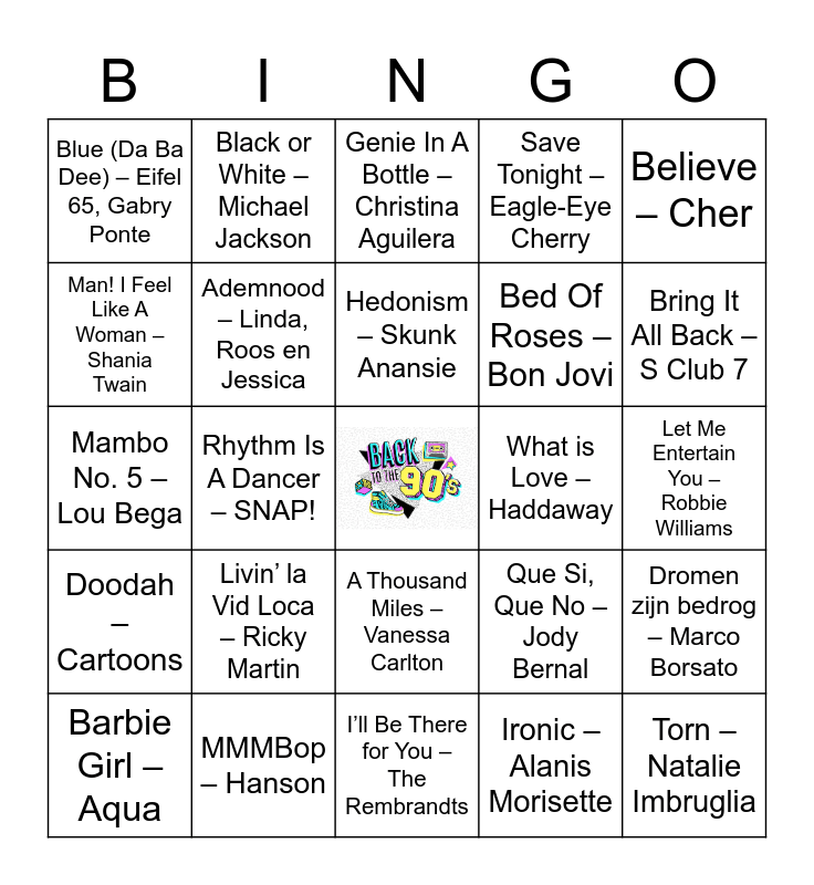This bingo card has a free space and 45 words: I Want It That Way – Backstreet Boys, Torn – Natalie Imbruglia, Wannabe – Spice Girls, Barbie Girl – Aqua, …Baby One More Time – Britney Spears, Ironic – Alanis Morisette, Genie In ABottle – Christina Aguilera, All that She Wants – Ace of Base, Believe – Cher, MMMBop – Hanson, Save Tonight – Eagle-Eye Cherry, What is Love – Haddaway, A Thousand Miles – Vanessa Carlton, Livin’ la Vid Loca – Ricky Martin, Two Princes – Spin Doctors, I’ll Be There for You – The Rembrandts, Uptown Girl – Westlife, Mambo No. 5 – Lou Bega, Macarena – Los Del Rio, Bring It All Back – S Club 7, Black or White – Michael Jackson, Let’s Get Loud – Jennifer Lopez, U Can’t Touch This – MC Hammer, Blue (Da Ba Dee) – Eifel 65, Gabry Ponte, Survivor – Destiny’s Child, Let Me Entertain You – Robbie Williams, Ice Ice Baby – Vanilla Ice, Sexbomb – Tom Jones, Que Si, Que No – Jody Bernal, Doodah – Cartoons, Sweat – Inner Circle, Dromen zijn bedrog – Marco Borsato, We’re Going to Ibiza – Vengaboys, Wonderwall – Oasis, Narcotic – Liquido, Rhythm Is A Dancer – SNAP!, Together Again – Janet Jackson, Insomnia – Faithless, I Have Nothing – Whitney Houston, Hedonism – Skunk Anansie, Man! I Feel Like A Woman – Shania Twain, Bed Of Roses – Bon Jovi, Can’t Fight The Moonlight – LeAnn Rimes, Ademnood – Linda, Roos en Jessica and What’s Up? 4 Non Blondes.