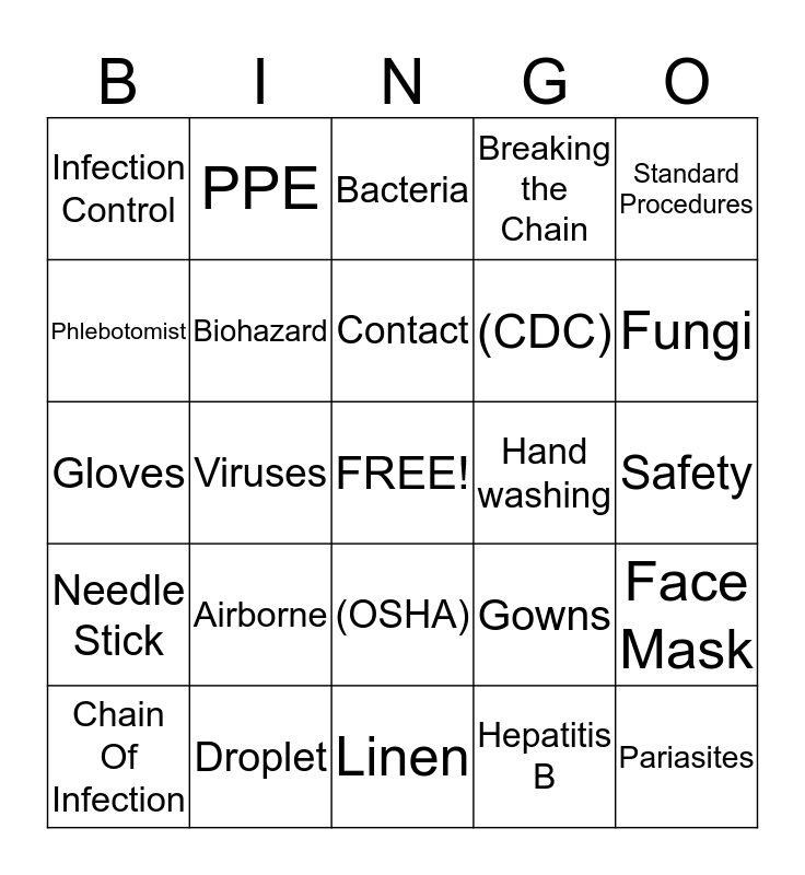This bingo card has a free space and 24 words: Airborne, Droplet, Contact, Chain Of Infection, Standard Procedures, Infection Control, Phlebotomist, PPE, Hand washing, (OSHA), (CDC), Gloves, Gowns, Face Mask, Biohazard, Hepatitis B, Safety, Bacteria, Fungi, Viruses, Pariasites, Needle Stick, Breaking the Chain and Linen.