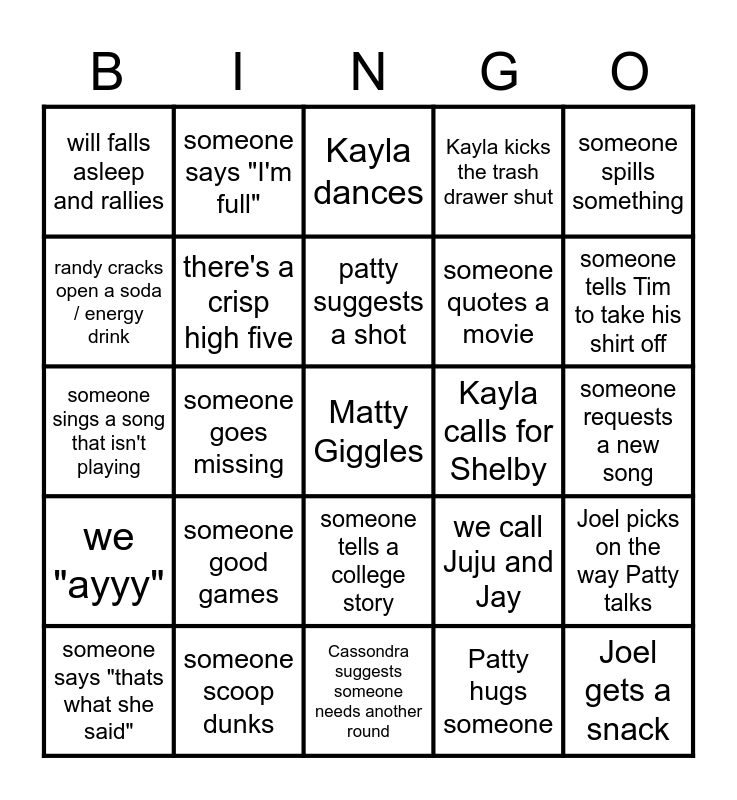 This bingo card has a free space and 24 words: someone good games, someone scoop dunks, patty suggests a shot, someone says "thats what she said", someone spills something, will falls asleep and rallies, randy cracks open a soda / energy drink, someone says "I'm full", Kayla calls for Shelby, someone tells a college story, someone quotes a movie, someone sings a song that isn't playing, we call Juju and Jay, Joel picks on the way Patty talks, there's a crisp high five, Patty hugs someone, someone requests a new song, Kayla dances, someone tells Tim to take his shirt off, someone goes missing, Joel gets a snack, we "ayyy", Kayla kicks the trash drawer shut and Cassondra suggests someone needs another round.
