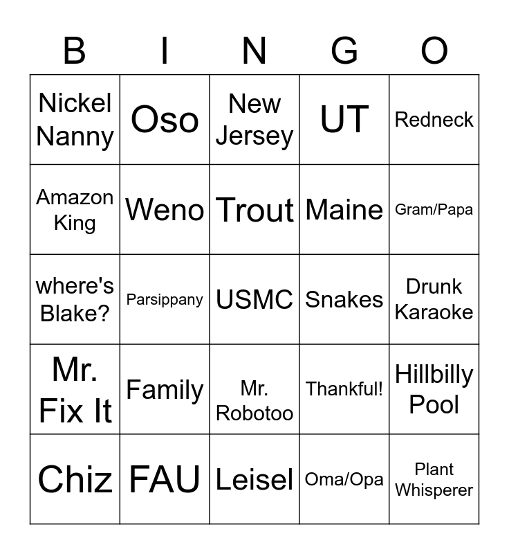 This bingo card has 25 words: Family, Leisel, Trout, Chiz, Redneck, Nickel Nanny, Amazon King, Oso, Snakes, Mr. Robotoo, Maine, where's Blake?, Thankful!, Hillbilly Pool, Weno, Plant Whisperer, Drunk Karaoke, New Jersey, Gram/Papa, Parsippany, USMC, FAU, Mr. Fix It, UT and Oma/Opa.